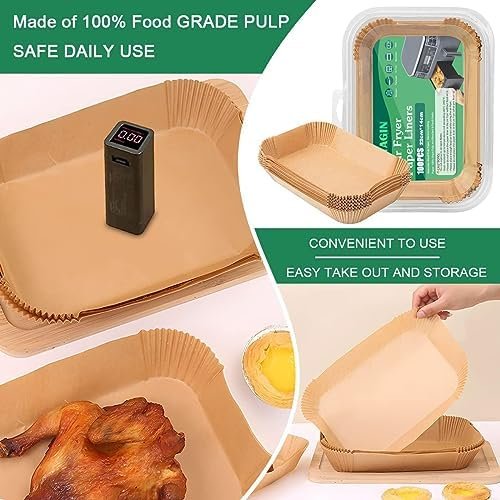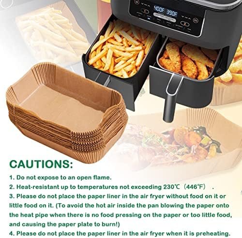 ✅【Food Grade Material】Our rectangle air fryer disposable paper liners are made of food-grade unbleached parchment paper with double-sided silicone oil coating, no fluorescent, BPA-free to strict quality standards. High temperature resistance up to 428 degrees Fahrenheit, maintaining integrity and aesthetic appearance of bread, dumplings, snacks. Oil proof parchment paper liners are no affection to the taste of food and the hot air circulation of air frying.