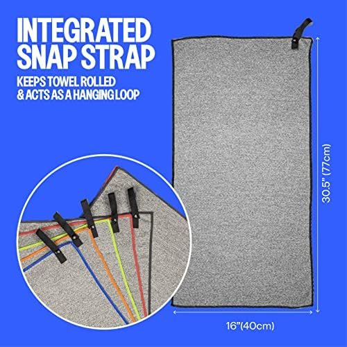 ULTRA COMPACT, LIGHTWEIGHT, STAY CLEAN WITH HANGING LOOP: With an integrated snap strap closure that doubles as a hanging loop over the door, your backpack, or bottle. the large thin towel rolls up into a packable travel-friendly size. Perfect for anyone who travels light.