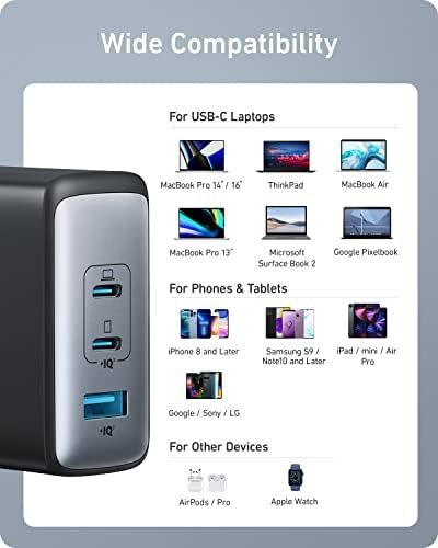 Provide a powerful charge for a huge-range of laptops including the 2023 15‑inch MacBook Air, 2021 MacBook Pro 14” (M1 Pro), HP Spectre x360, Dell XPS 13, and more when you connect to either USB-C port.