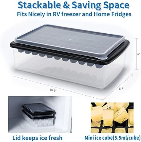 Stackable Ice Tray with lid and Bin: Space-saving master. Perfect compact size is 10.6(L) x 6.7(W) x 3(H) inches, fits nicely in RV refrigerator and Home Fridges. This 3 in 1 set includes: 1 ice cube tray with lid, 1 storage container, 1 ice scooper.