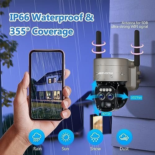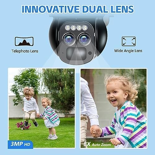 • 8X Zoom Security Camera & 360°Coverage: 8X Digital zoom-in for you see clearer details with enlarged image. The PTZ outdoor security cameras wireless outdoor wifi supports horizontal 355°and vertical 90°pan-tilt rotation auto tracking, providing you with 360°all-round protection almost no blind spots. You can also manually rotate the wifi camera to see different directions and monitor any corner remotely via the APP, protecting your property and family!