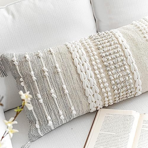 BlissBlush Gray Decorative Lumbar Pillow Cover 14×36, Boho Long Throw Pillow