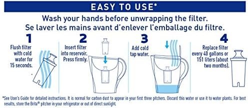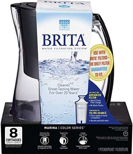 Brita makes it easy to drink healthier, great tasting water for pennies per litre. Brita Marina Water Filter Pitcher is BPA free, and reduces chlorine taste and odour, copper, mercury and cadmium, all of which may be commonly found in tap water. For optimal performance, use the filter indicator to track when to replace the advanced filter. Its 8 cup capacity makes this pitcher perfect for your home or office. Ergonomically designed, this water pitcher features a flip top lid for no fuss refilling and a comfort grip handle for easier pouring. And its modern rounded design adds a chic look to the home or office. Plus one water filter can replace up to 300 standard 500 millilitre plastic water bottles, cutting down on waste and saving you money. Get great taste, less waste and more savings from Brita.