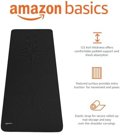 Amazon Basics Extra Thick Exercise Yoga Gym Floor Mat with Carrying Strap – 74 x 24 x .5 Inches, Black