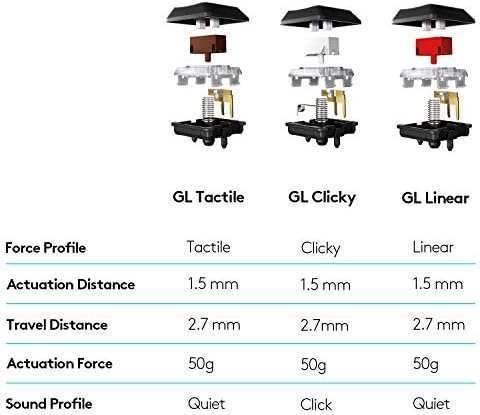 - Low Profile mechanical switches offers the speed, accuracy and performance of a mechanical switch at half the height. The GL Linear switch features a completely smooth keystroke through the point of actuation. Comes in 3 options: GL Tactile, GL Linear or GL Clicky.