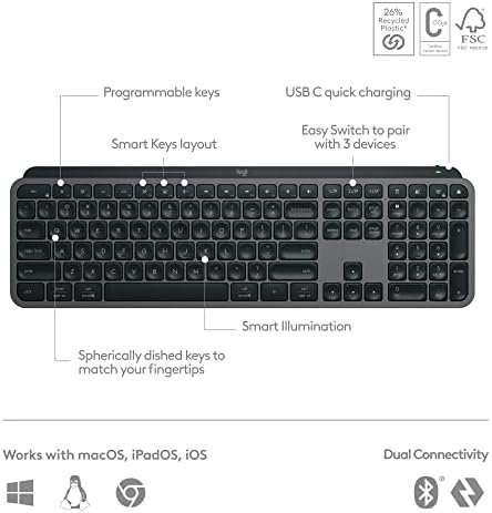 - Recycled: Plastic parts in MX Keys S Wireless Keyboard include certified post-consumer recycled plastic — 26% for Graphite and 11% for Pale Grey (5)