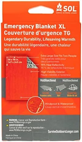 The SOL Emergency Blanket XL is meticulously designed never to fail when you’re counting on it with your life. It all starts with the material, vacuum-metalized polyethylene, that reflects 90% of your body heat back to you. Unlike traditional mylar blankets, SOL Emergency Blankets open easily, will not shred if nicked or punctured, are quiet and won’t crinkle in high winds. The high-visibility orange exterior makes it easy for rescuers to find you. Sized to fit two people.