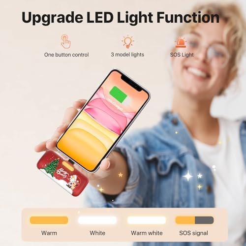 - 4 Modes LED Light & Fast Recharging: small portable charger with LED lantern that can be switched to 3 colors of warm – white – warm white, you can use it as fill light for selfies and flashlight in the dark. Recharging the cell phone charger for 50% power within 30 mins with provided USB C cable and adapter(not included), which can charge your iPhone 14 from 20% to 60% without using the phone.