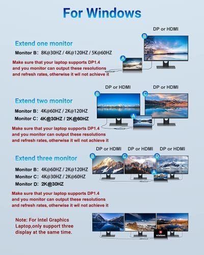 - DOCKING STATION FOR GAMING LAPTOP This triple monitors USB C hub allows you outputting single 8K@30HZ, 4K@120HZ or 5K@60HZ monitor, 4K@60HZ and 4K@30HZ dual monitor, 4K@60HZ, 4K@30HZ and 2K@60HZ Triple monitor under DP1.4 protocol.( Note: MacOS system, the screens of external monitors are the same, no matter they are displayed in mirror mode or extended mode.)