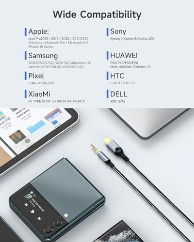 - Relief Strain Design & Wide Compatibility: With the relief strain design, this usb c to 3.5mm male headphone cord can stand 15000+ bending tests, which makes this aux cord much more durable. This USB Type C to audio cable is for most of type c devices. Such as compatible with iPhone 15 Pro Max , 15 Pro , 15 , for iPad Pro 2018, Macbook, Chromebook, Google Pixel 2/3/4 XL, Oneplus 6T 7 7Pro, Samsung S23 S22 S21 S20 Ultra S20 Z Flip S20+ S10 S9 S8 Plus, Note 20 ultra 10 10+ 9 , Huawei, Xiaomi,etc.